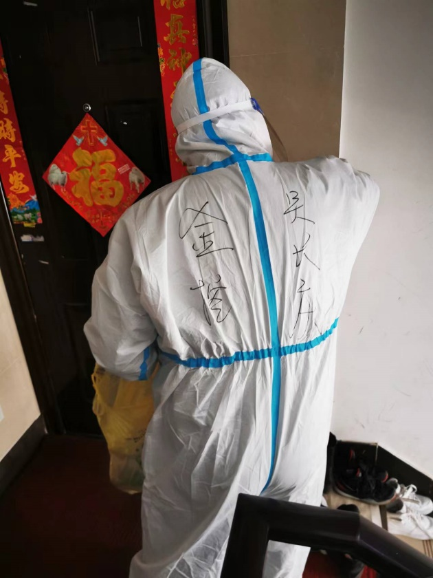 圖為志愿者吳長慶參加敲門行動,發(fā)放抗原檢測試劑